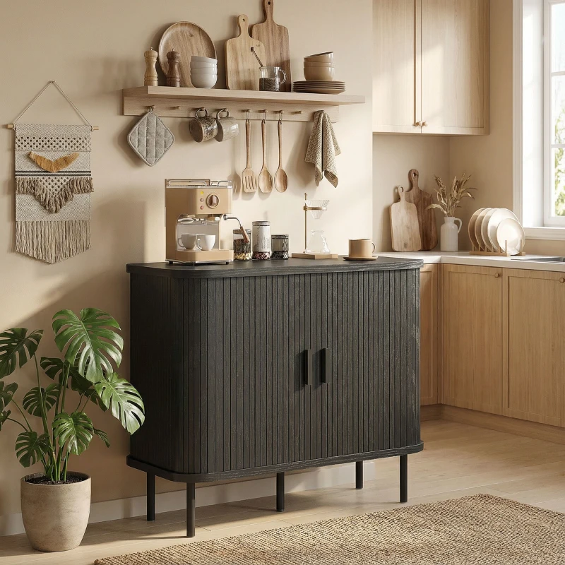 HOMCOM 35.4" Sideboard Buffet Cabinet with Storage, Nordic Coffee Bar Cabinet with Slatted Tambour Doors and Metal Legs, Black