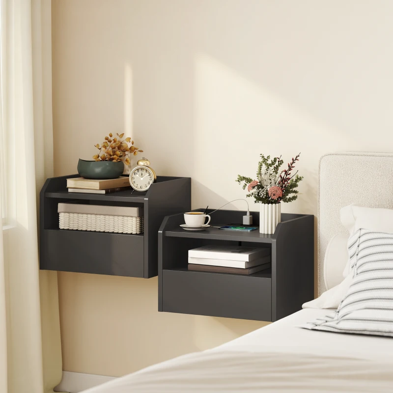Tired of bedside clutter and searching for outlets? This nightly scramble for chargers and space disrupts your peace. The set of two floating nightstands from HOMCOM restores harmony. With a built-in charging station, drawer, and open shelf, this pair of bedside tables keeps essentials organized and devices powered. Create a balanced, serene bedroom where everything has its place, allowing you to unwind completely and wake up refreshed.