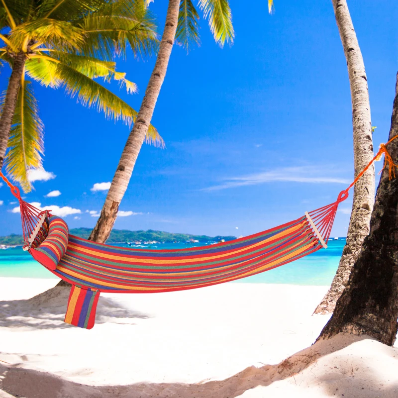 Outsunny Cotton Hammock Portable Soft Swing Sleeping w/ Headrest & Side Pocket Deluxe Swing Chair for Beach, Yard, Bedroom, Patio, Porch, Indoor, Outdoor, Rainbow Stripes