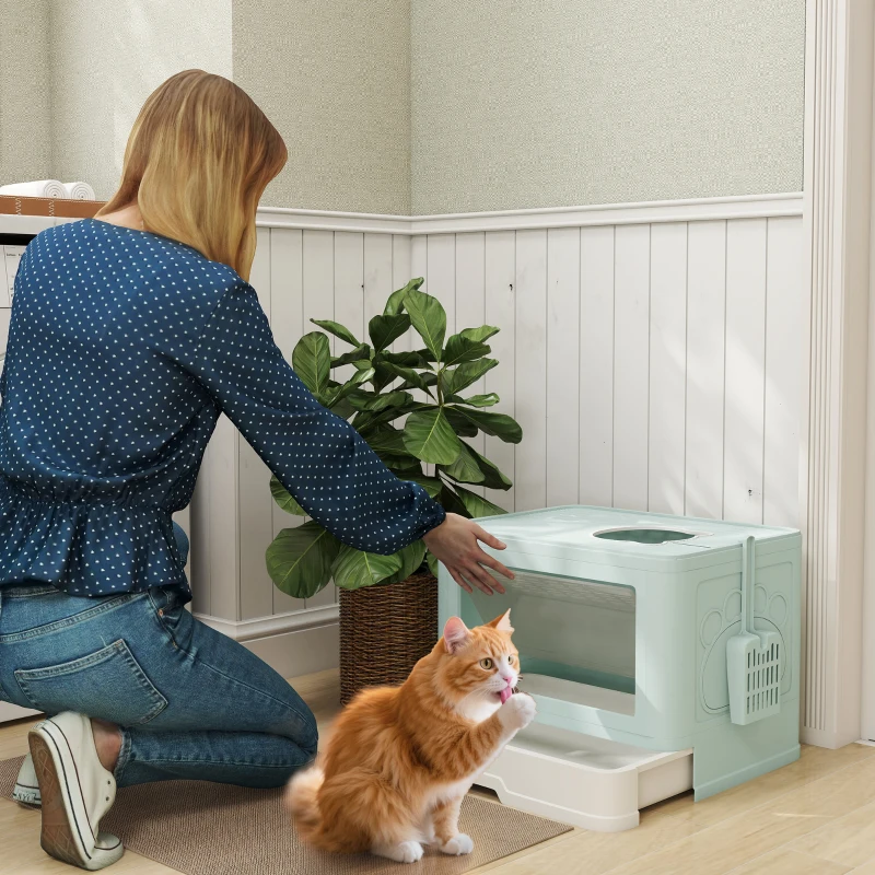 PawHut Cat Litter Box, Front Enter & Top Exit Cat Litter Tray with Scoop, Pull-out Tray, Easy to Clean, Green